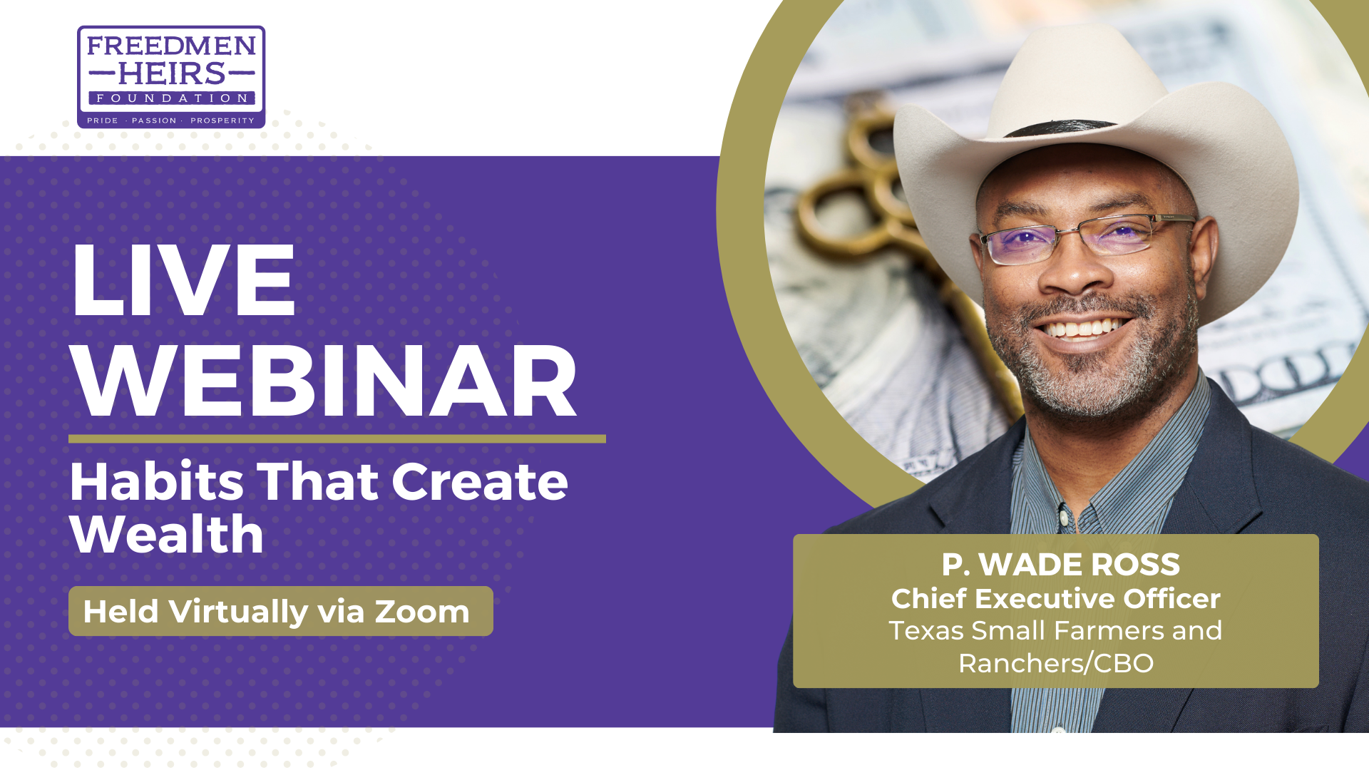 Join us as we discuss practices that can be used to create generational wealth with Mr. P. Wade Ross, Chief Executive of the Texas Small Farmers & Ranchers/Community-Based Organization. Mr. Ross will touch on common wealth-building barriers that exist and outline seven principles to immediately include in our daily lives to change the financial narrative for our families